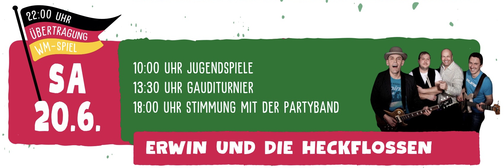 10:00 Uhr: Jugendspiele 13:30 Uhr: Gauditurnier 18:00 Uhr: Stimmung mit der Partyband Erwin und die Heckflossen